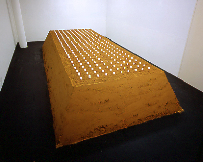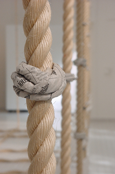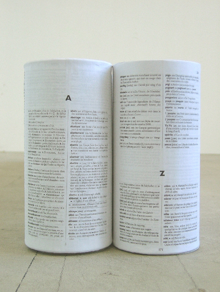 Dans mes œuvres le mot est tantôt présent comme tel (journaux, livres, distionnaires, caractère en plomb), tantôt suggéré par divers éléments visuels dont la craie, le tableau ou différents types de papier à écrire. Mais quelle qu'en soit la mise en scène il ressort toujours investi d'une présence silencieuse ou mieux d'une présence qui s'efforce d'éveiller le silence plutôt que de le combler. C'est cette présence qu'il m'importe de montrer et de faire sentir car j'y devine la condition première d'une remise en cause de notre relation avec le mot comme avec le monde, et par là même d’une expérience plus profonde de la réalité.