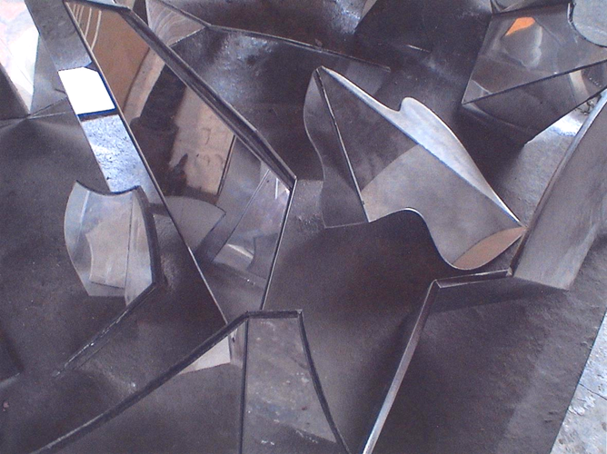 Mon travail, est actuellement monumental, réalisé en acier inoxydable dont les surfaces polies-miroirs sont fragmentées par des pliures inclinées, selon des angles différents. En réfléchissant les lumières et les images de vues inhabituelles, l'oeuvre démultiplie certains éléments du site pour en révéler toute leur vitalité et leur poésie.